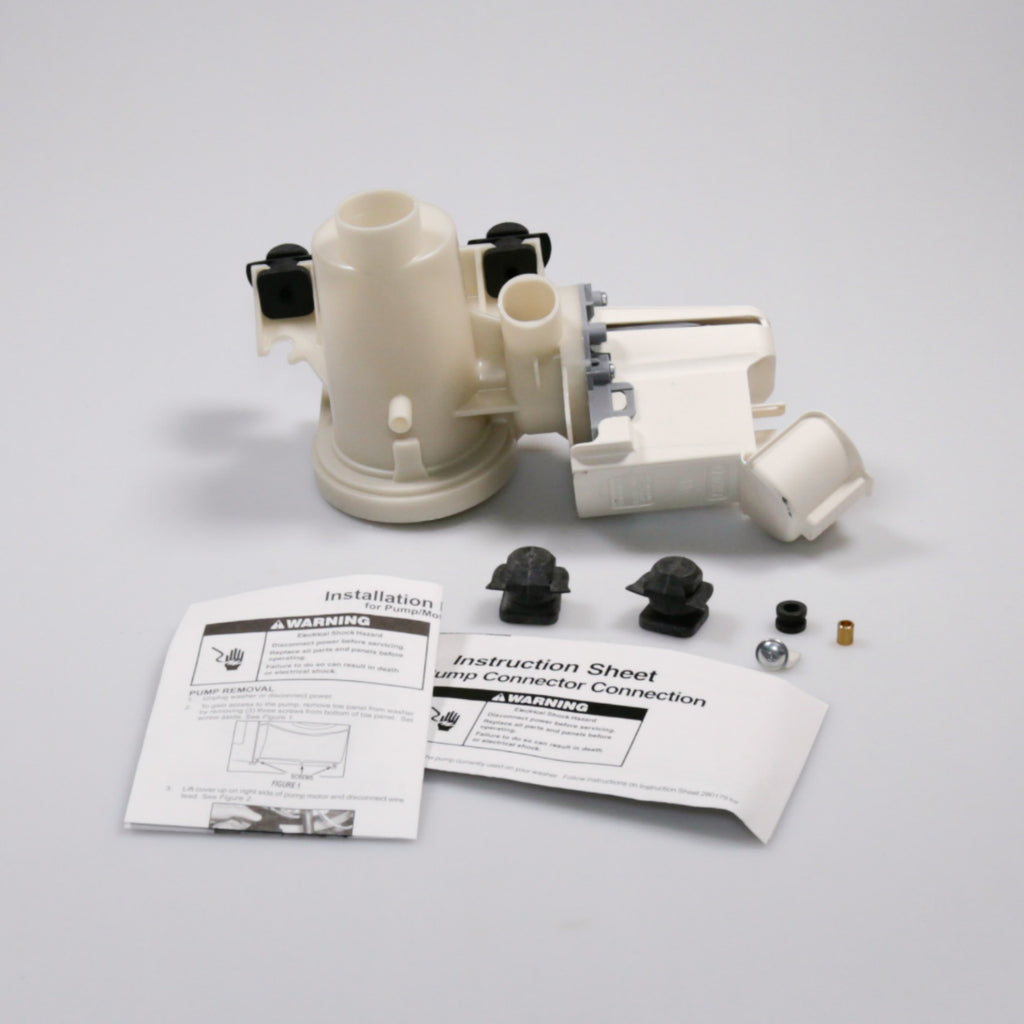 This Front Load Washer Drain Pump removes water from your front-load washer during the drain portion of the wash cycle. Includes the complete pump and motor assembly. If your washer doesn’t drain properly, replacing this part may alleviate the issue. Replacing this part will require basic hand tools, some disassembly of the washer and novice repair experience. You must unplug the washing machine or shut off the house circuit breaker for the appliance before installing this part. Also make sure you turn off the hot and cold water supplies.